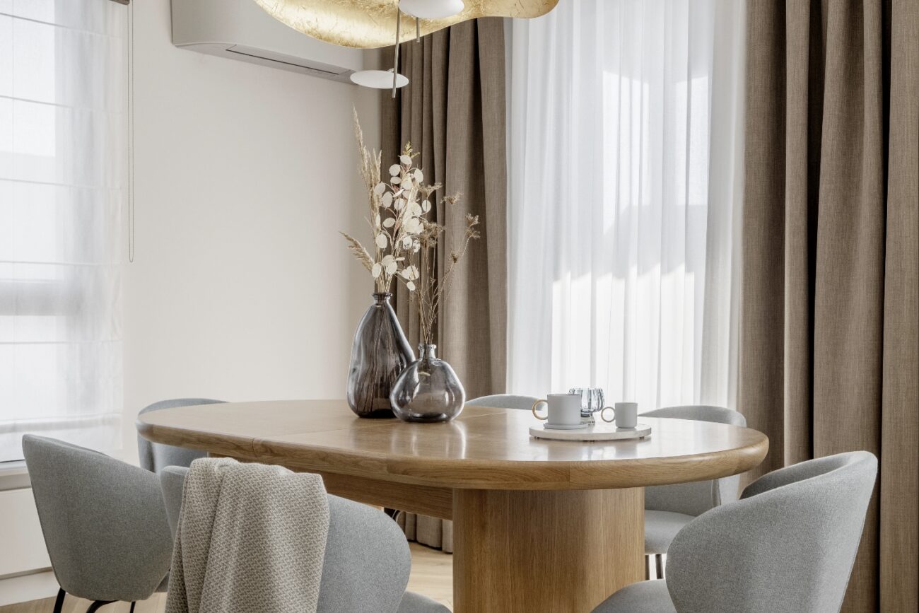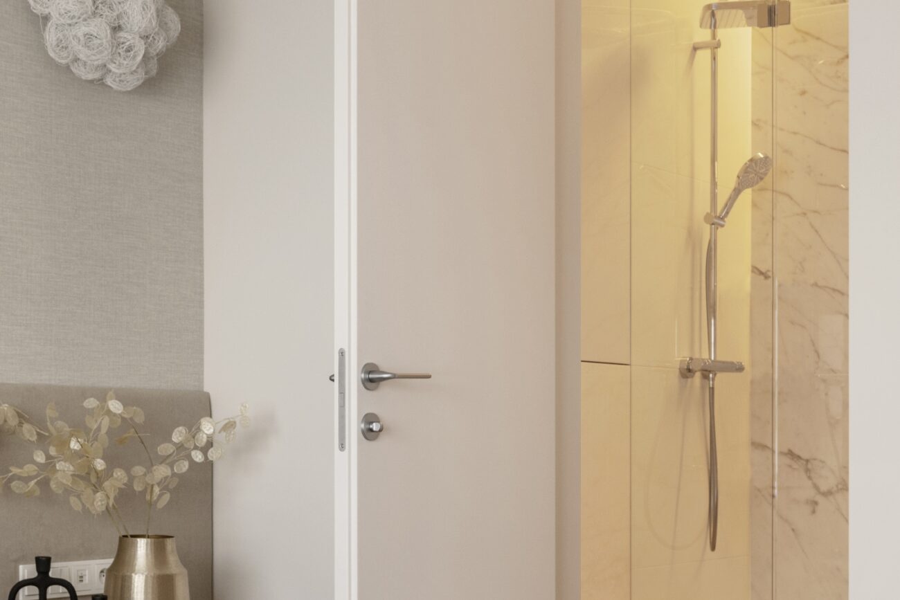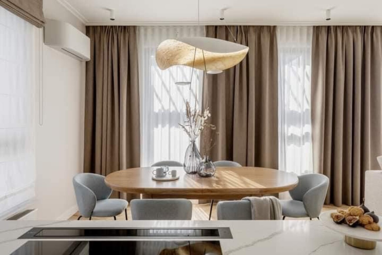 Dopracowany układ funkcjonalny, wysublimowane detale i kontrastowa gra faktur – te elementy definiują wnętrza ponad stumetrowego apartamentu na osiedlu Nova Królikarnia na warszawskim Mokotowie. Kolorystyka wnętrza obraca się wokół naturalnych, ciepłych odcieni beżu, które stanowią neutralne tło dla kontrastujących, ciemniejszych brązów oraz delikatnego błękitu. Gdzieniegdzie pojawiają się mocniejsze, czarne akcenty uzupełnione ponadczasowymi złotymi dodatkami. W strefie wejściowej dominuje piękna, wzorzysta podłoga oraz pojemna zabudowa garderobiana z wyrazistym akcentem ryflowanych frontów. Okazała strefa dzienna w niewymuszony sposób łączy przestrzeń do wypoczynku z wygodną kuchnią i jadalnią. Naturalny parkiet w postaci jodełki węgierskiej, proporcjonalna sofa oraz delikatna forma listwy gzymsowej dodają elegancji tej przestrzeni. Subtelne boniowanie ściany stanowi kontynuację podziałów zabudowy kuchennej dzięki czemu spaja wizualnie te dwa elemety. Strefę wypoczynku, poza sofą, podkreśla subtelnie podświetlony regał, w którym połączone zostały takie materiały jak płótno, czarna stal i ryflowane fronty. W toalecie dostępnej z holu wejściowego znajdziemy mozaikę zestawioną z tapetą strukturalną oraz złotą armaturą i akcesoriami. Strefa nocna składa się z trzech sypialni, łazienki gościnnej, pomieszczenia gospodarczego i gabinetu. Stylistyka sypialni głównej nawiązuje do pozostałych pomieszczeń mieszkania. Szerokie, wygodne łóżko zwieńczone tapicerowanym wezgłowiem stanowi punkt centralny pomieszczenia, które połączone jest z prywatną łazienką. Gabinet stanowi spokojne, przytulne miejsce do pracy. Łazienka gościnna charakteryzuje się kontrastową podłogą oraz mocnym akcentem kolorystycznym w postaci granatowej szafki umywalkowej.