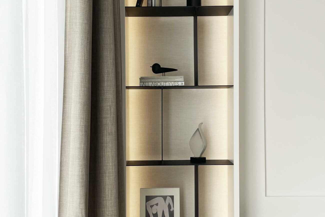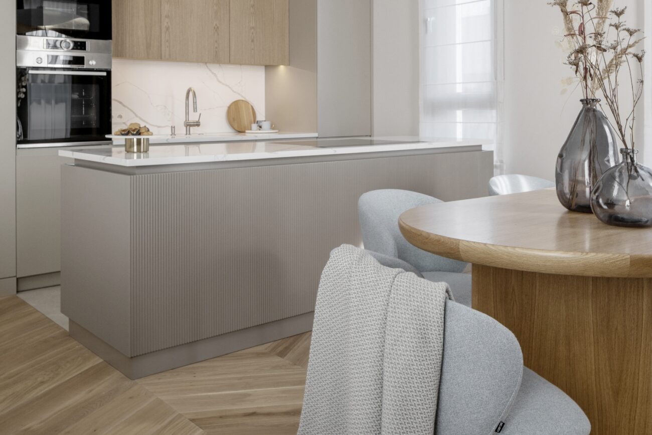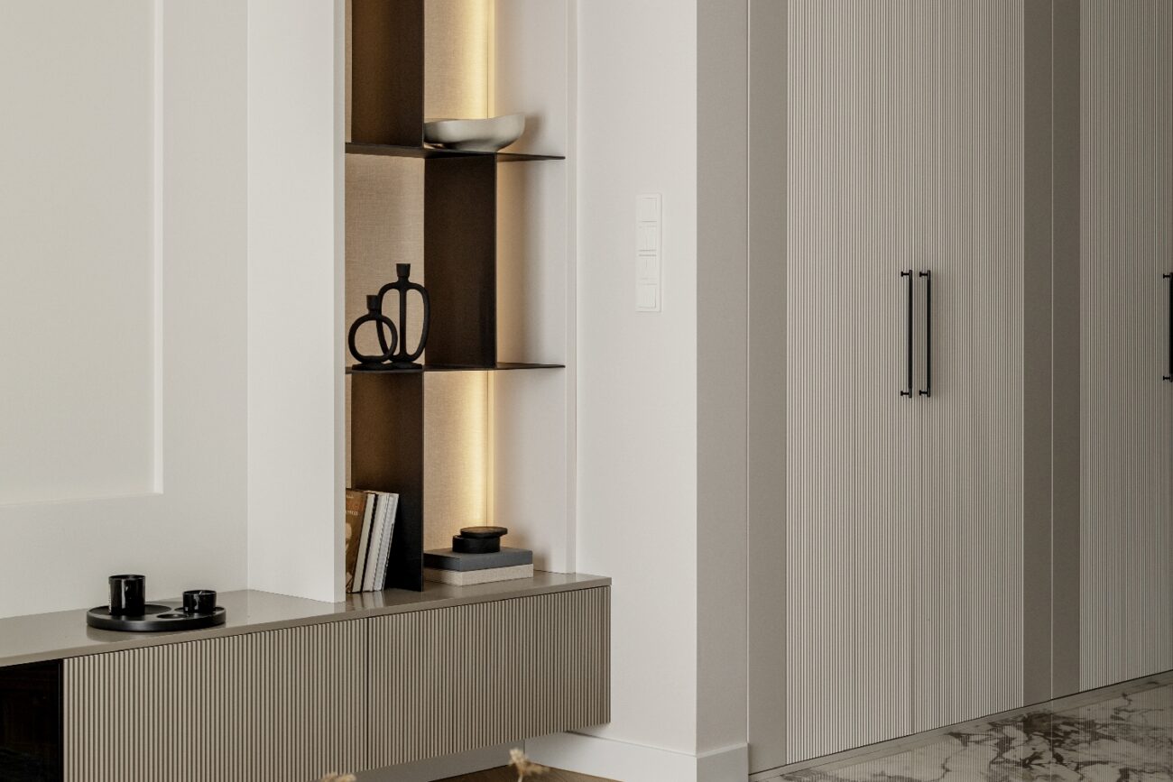 Dopracowany układ funkcjonalny, wysublimowane detale i kontrastowa gra faktur – te elementy definiują wnętrza ponad stumetrowego apartamentu na osiedlu Nova Królikarnia na warszawskim Mokotowie. Kolorystyka wnętrza obraca się wokół naturalnych, ciepłych odcieni beżu, które stanowią neutralne tło dla kontrastujących, ciemniejszych brązów oraz delikatnego błękitu. Gdzieniegdzie pojawiają się mocniejsze, czarne akcenty uzupełnione ponadczasowymi złotymi dodatkami. W strefie wejściowej dominuje piękna, wzorzysta podłoga oraz pojemna zabudowa garderobiana z wyrazistym akcentem ryflowanych frontów. Okazała strefa dzienna w niewymuszony sposób łączy przestrzeń do wypoczynku z wygodną kuchnią i jadalnią. Naturalny parkiet w postaci jodełki węgierskiej, proporcjonalna sofa oraz delikatna forma listwy gzymsowej dodają elegancji tej przestrzeni. Subtelne boniowanie ściany stanowi kontynuację podziałów zabudowy kuchennej dzięki czemu spaja wizualnie te dwa elemety. Strefę wypoczynku, poza sofą, podkreśla subtelnie podświetlony regał, w którym połączone zostały takie materiały jak płótno, czarna stal i ryflowane fronty. W toalecie dostępnej z holu wejściowego znajdziemy mozaikę zestawioną z tapetą strukturalną oraz złotą armaturą i akcesoriami. Strefa nocna składa się z trzech sypialni, łazienki gościnnej, pomieszczenia gospodarczego i gabinetu. Stylistyka sypialni głównej nawiązuje do pozostałych pomieszczeń mieszkania. Szerokie, wygodne łóżko zwieńczone tapicerowanym wezgłowiem stanowi punkt centralny pomieszczenia, które połączone jest z prywatną łazienką. Gabinet stanowi spokojne, przytulne miejsce do pracy. Łazienka gościnna charakteryzuje się kontrastową podłogą oraz mocnym akcentem kolorystycznym w postaci granatowej szafki umywalkowej.